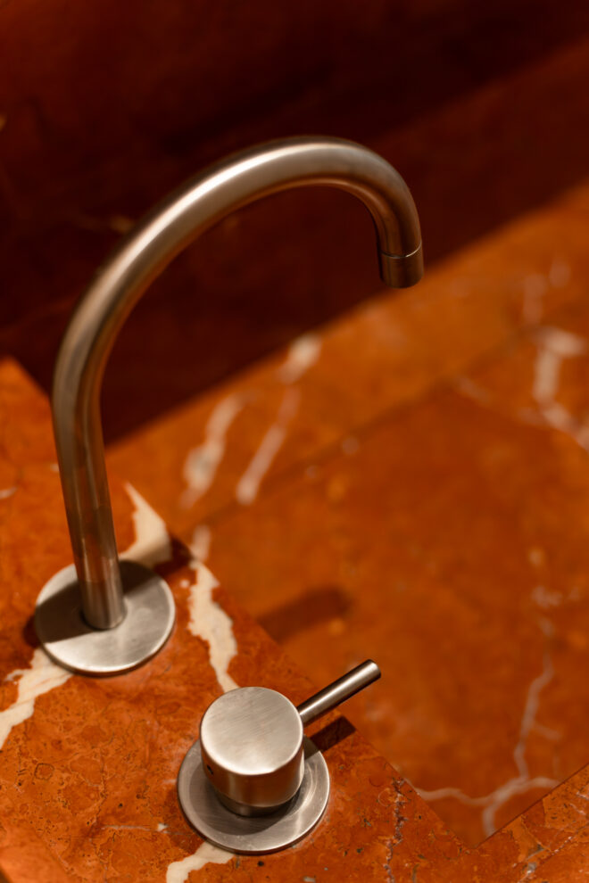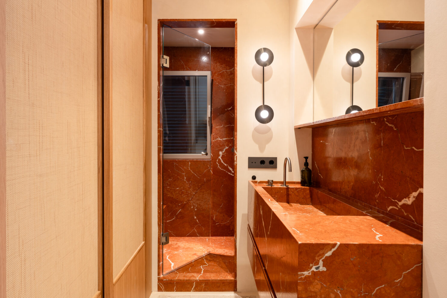 Upstairs, the thoughtful layout continues. Two inviting bedrooms feature built-in wardrobes, air conditioning and quiet outlooks. A central hallway offers extra storage solutions and a dedicated workspace, ideal for remote working or study. The main bathroom includes a stylish travertine washbasin and walk-in shower. And the real highlight? The elegant dark red marble that is used to finish the en-suite bathroom connected to the master bedroom.