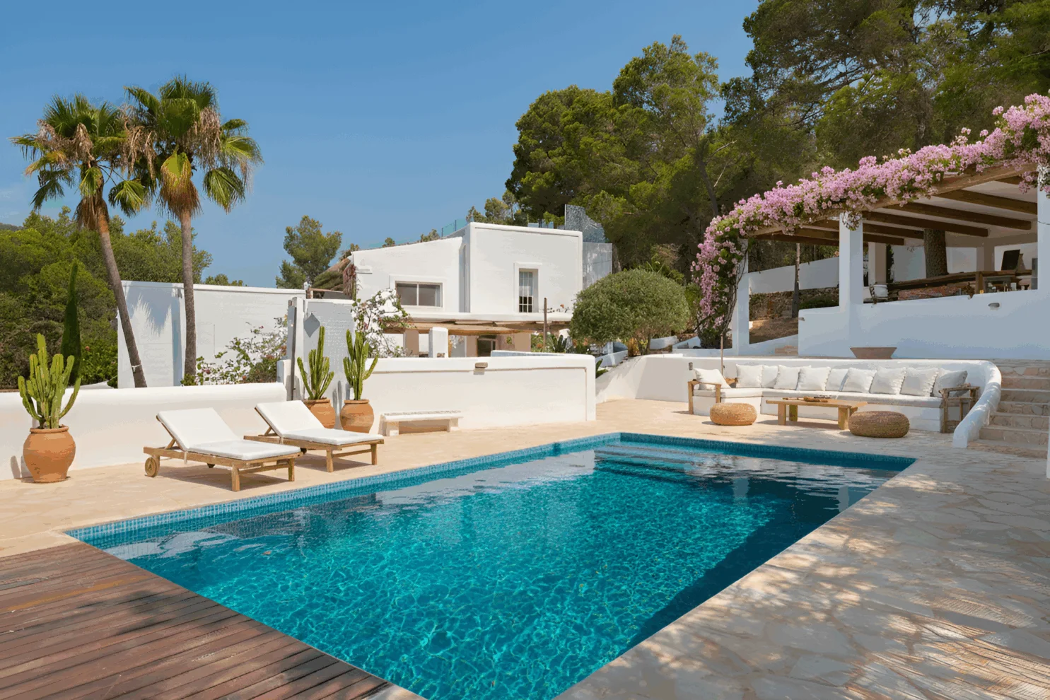 The first photo of the presentation is a render. Sometimes it is just hard to picture a space when it’s not fully decorated. We’ve used AI (wasn’t hard to tell I guess) to work on the improved version of the space. For this upgrade (wooden beams on the porch, some bougainvillea, furniture, pool tiles and plants) one would spend 20-40k, and look at the difference…