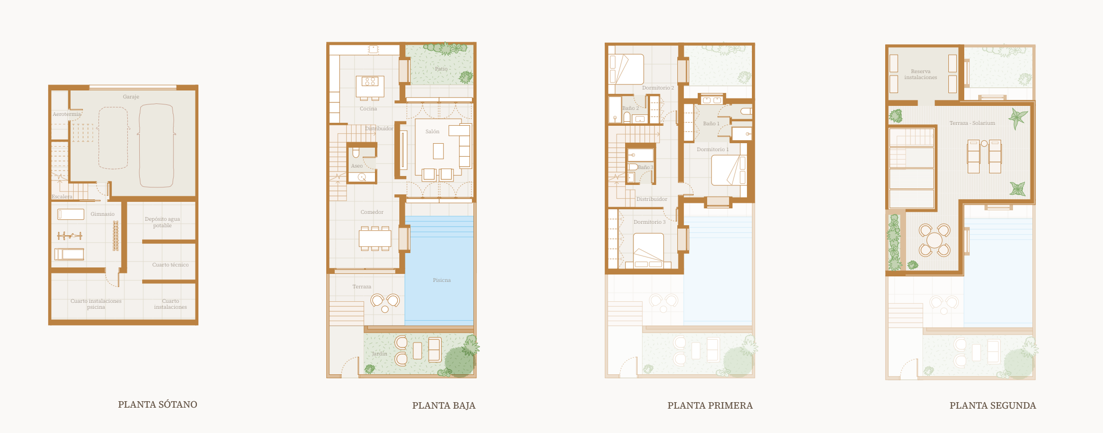 On the ground floor, you will find an open space living area with floor-to-ceiling sliding doors, a kitchen (18m² and colors to be customized), and direct access to your garden (~80–90m²) and private saltwater pool (30–33m²). On the rooftop, a 44m² solarium finished with Porcelanosa wood-effect tiles invites sunsets, stargazing with a glass of wine, or family dinners.