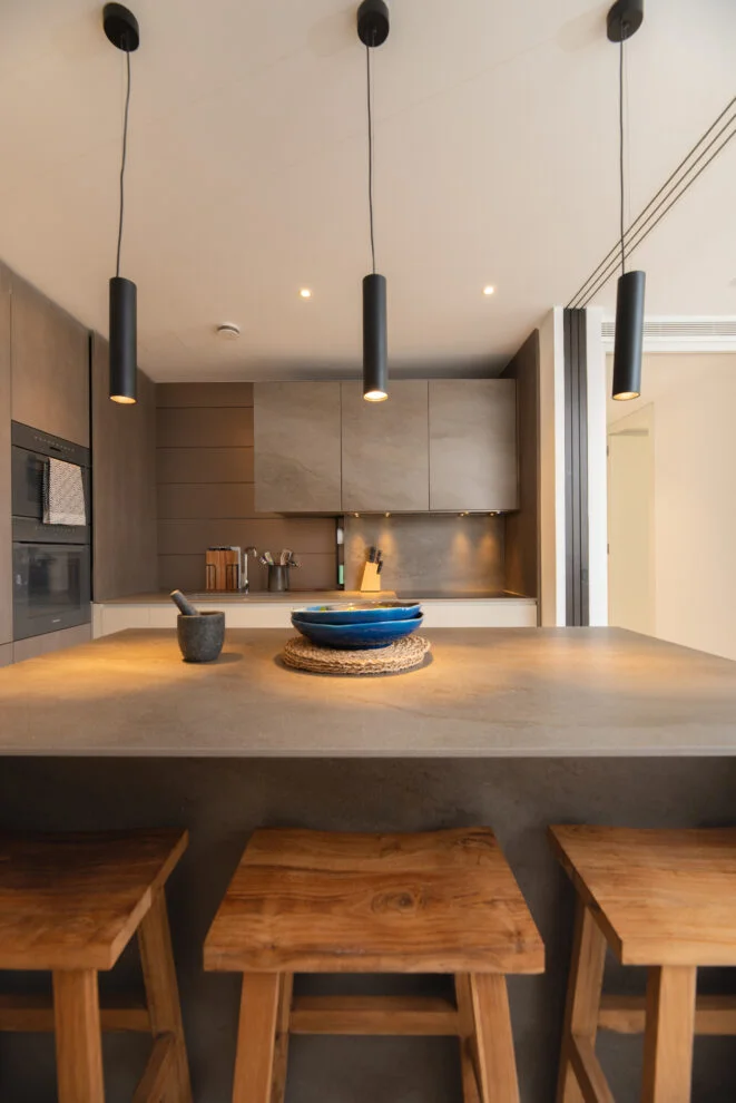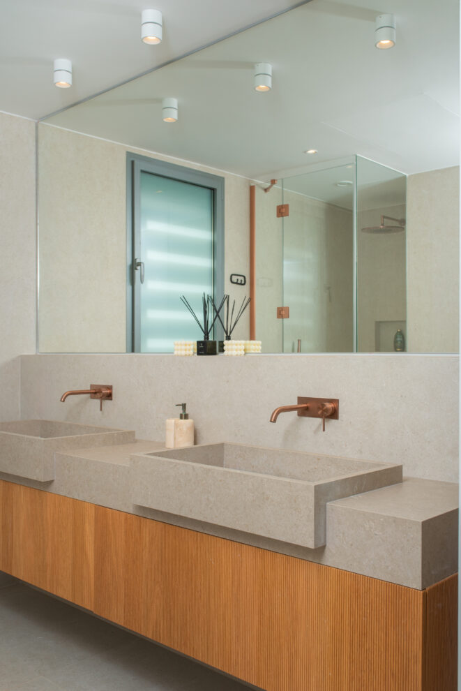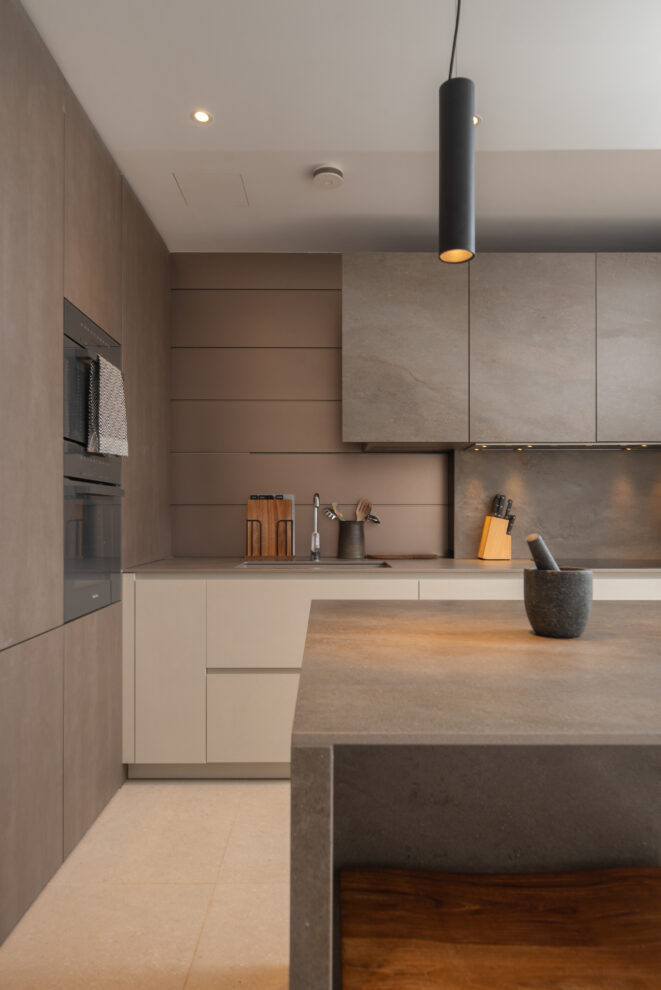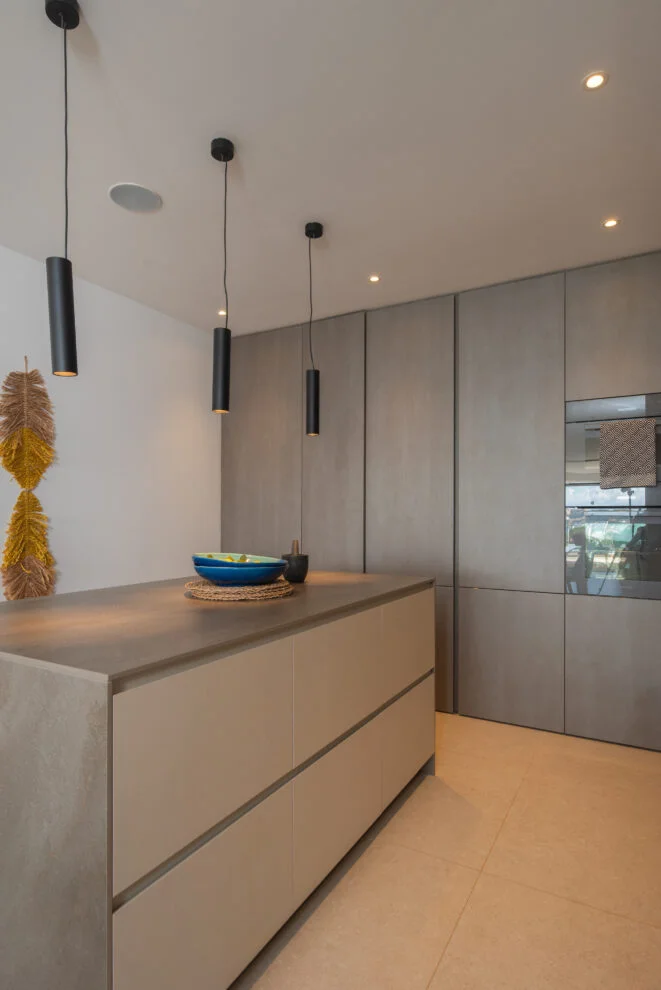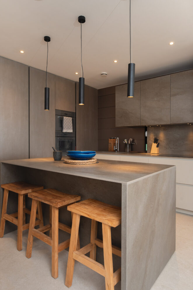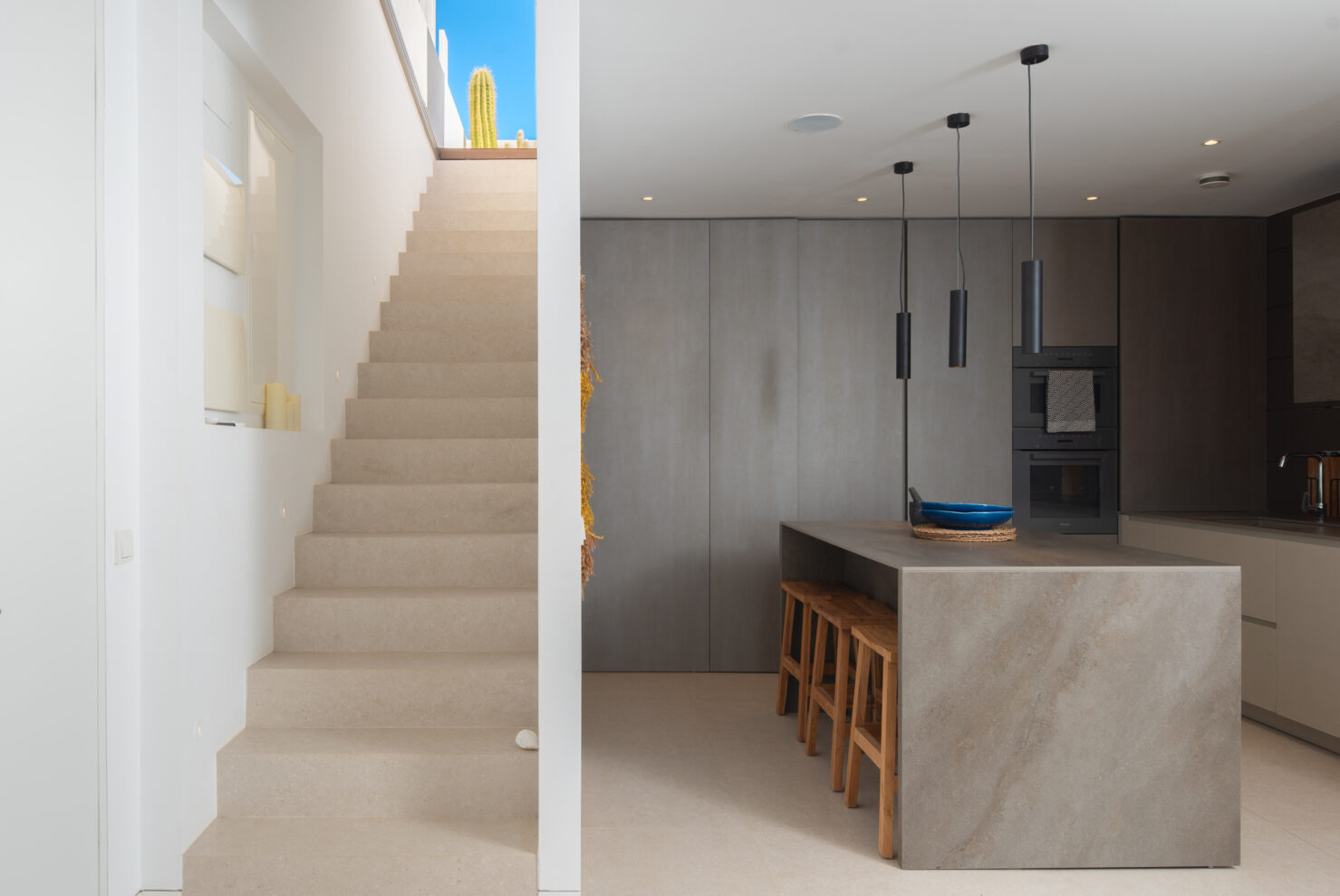 The interior has 169,70m² designed around an open-plan living space finished with large-format porcelain flooring and a Modulnova kitchen. The 3 bedrooms have en-suite bathrooms, and 1 bedroom comes with a separate bathroom. There is a direct access from the living area and one of the bedrooms to the 51,49m2 terrace on the lower floor.