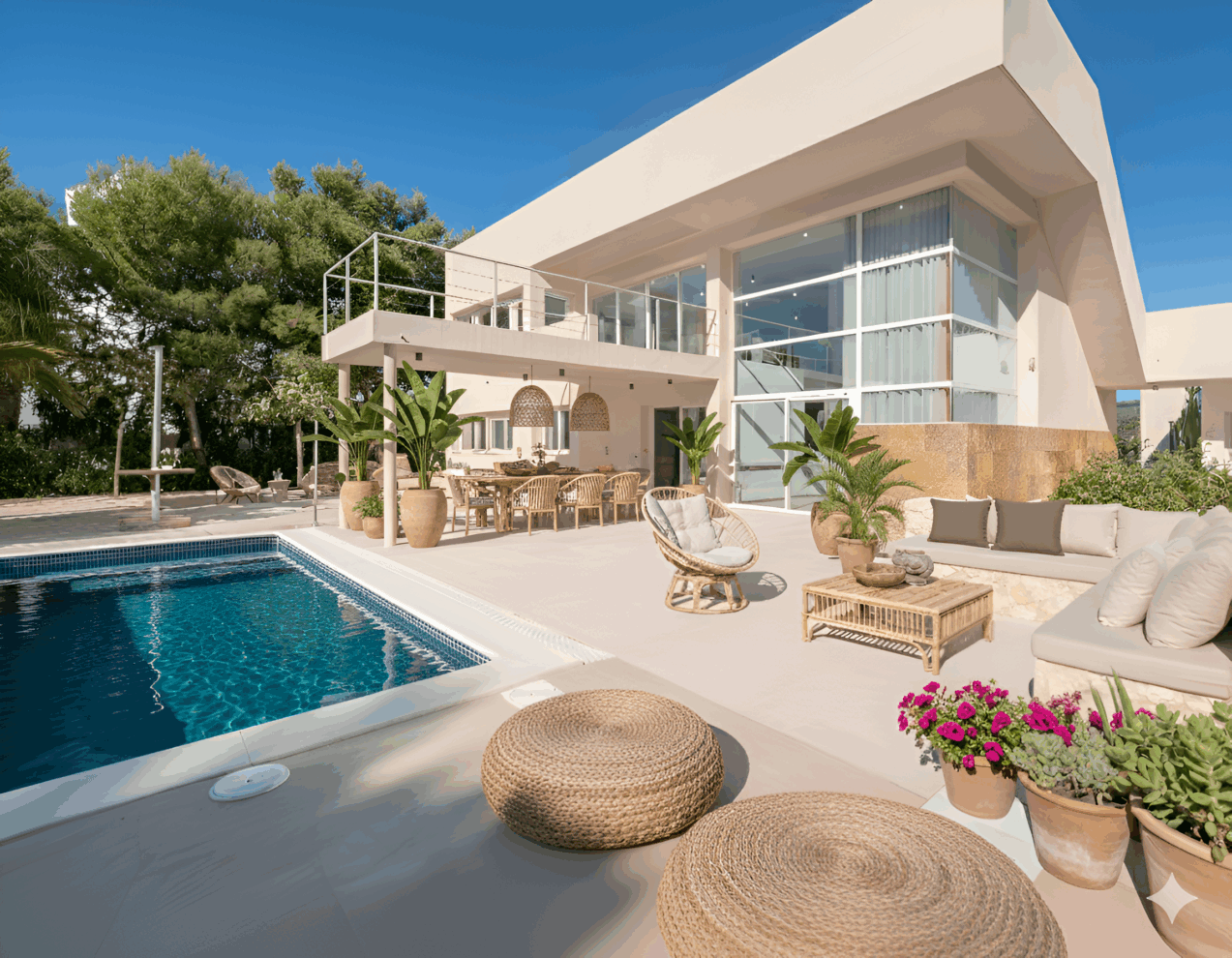 Close to nature, full of entertainment for the family Outdoors, the 32.571 m² plot becomes your private playground: / A cozy pool area with well-sized pool / Astro-turf football field / Beach-volleyball court invite both play and relaxation. / The extensive land opens endless opportunities for green projects or gardening / Evening cocktail sessions at your rooftop with views over the sea Fancy to move into nature? The area is perfect for cycling and hiking. The beach of Port des Torrent, with beach restaurants/bars such as XXX and XXX are super cozy and not more than a 10-minute ride on a bike away. Good connections The house is private, not isolated. Sant Josep is a 9-minute drive, Sant Antoni just 7 minutes, and the turquoise beaches of Cala Bassa, Cala Comte, and Cala Tarida are only 12 minutes away. One of our local favourites – Can Berri Vell, Es Ventall, and Es Cuco – are just minutes away from your house.In short, this is a perfect home for families or design-driven buyers looking for privacy and modernity. A villa built for all-year round living. Secure, sustainable, and ready for life’s next chapter.